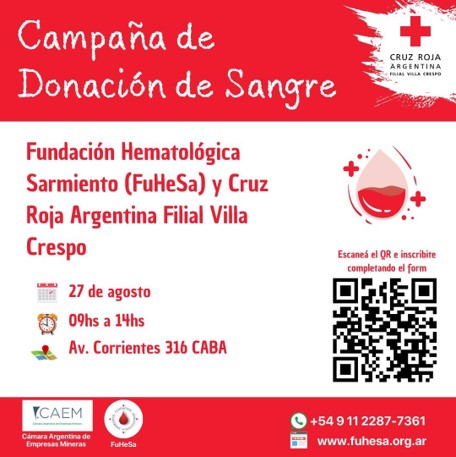 El próximo martes, la Cámara Argentina de Empresas Mineras (CAEM) realizará junto a la Cruz Roja una jornada de donación de sangre, Será el 27 de este mes, en su sede.